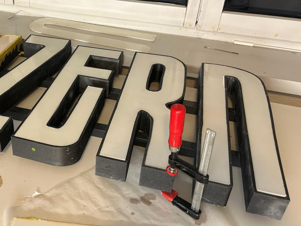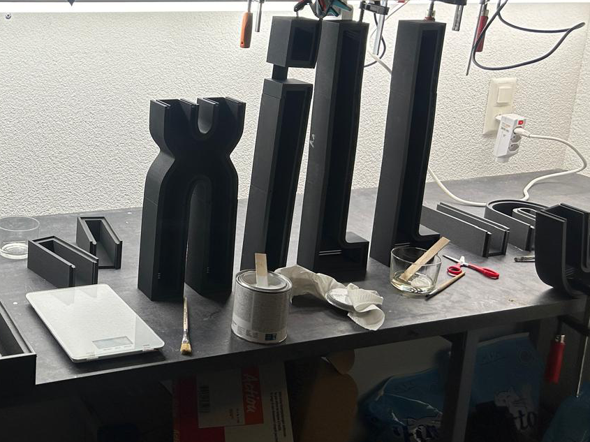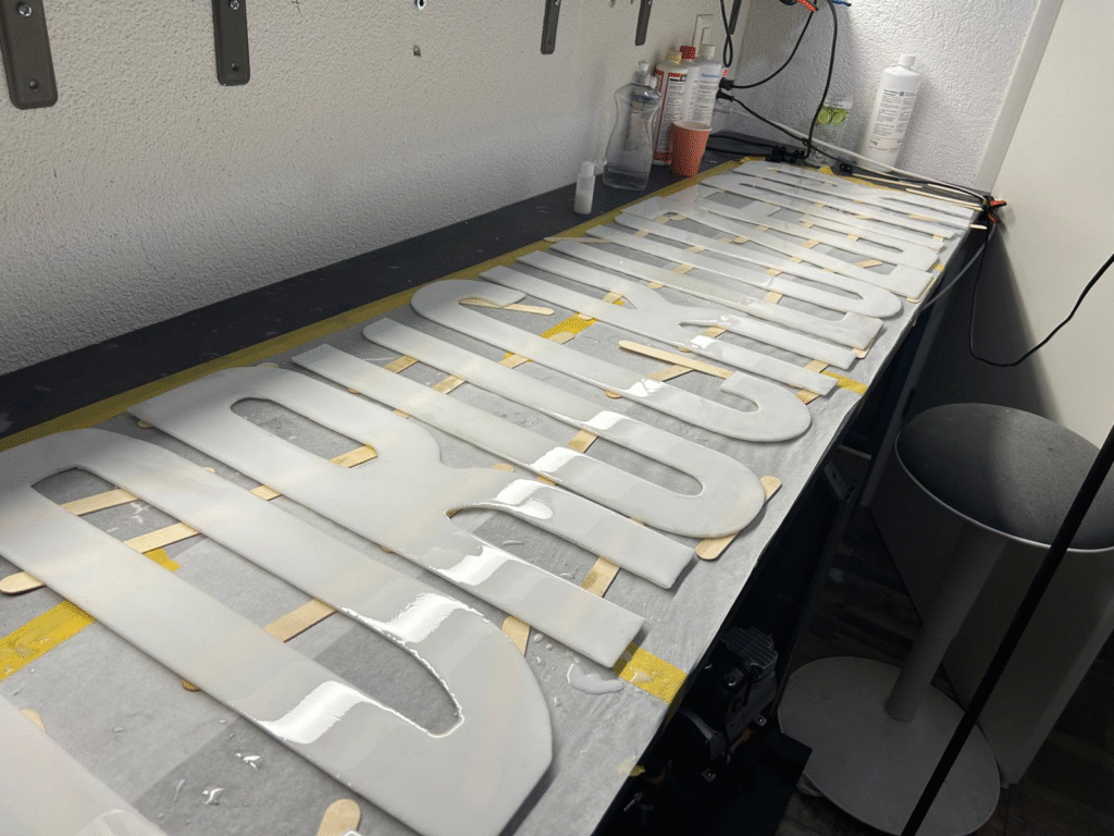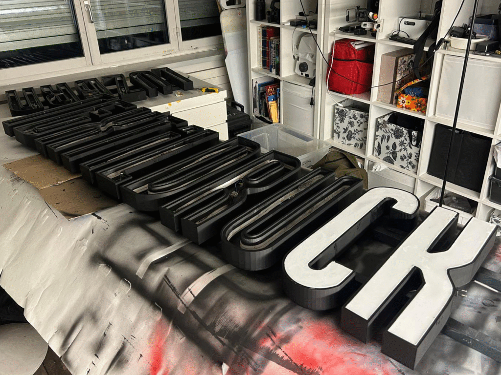 Die Leuchtbuchstaben haben wir übrigens komplett selbst hergestellt: Mit unserem 3D-Drucker gedruckt, sorgfältig zusammengeklebt, mit LED-Lampen ausgestattet, farbig lackiert – und die transparenten Deckel wurden von Hand gegossen.
